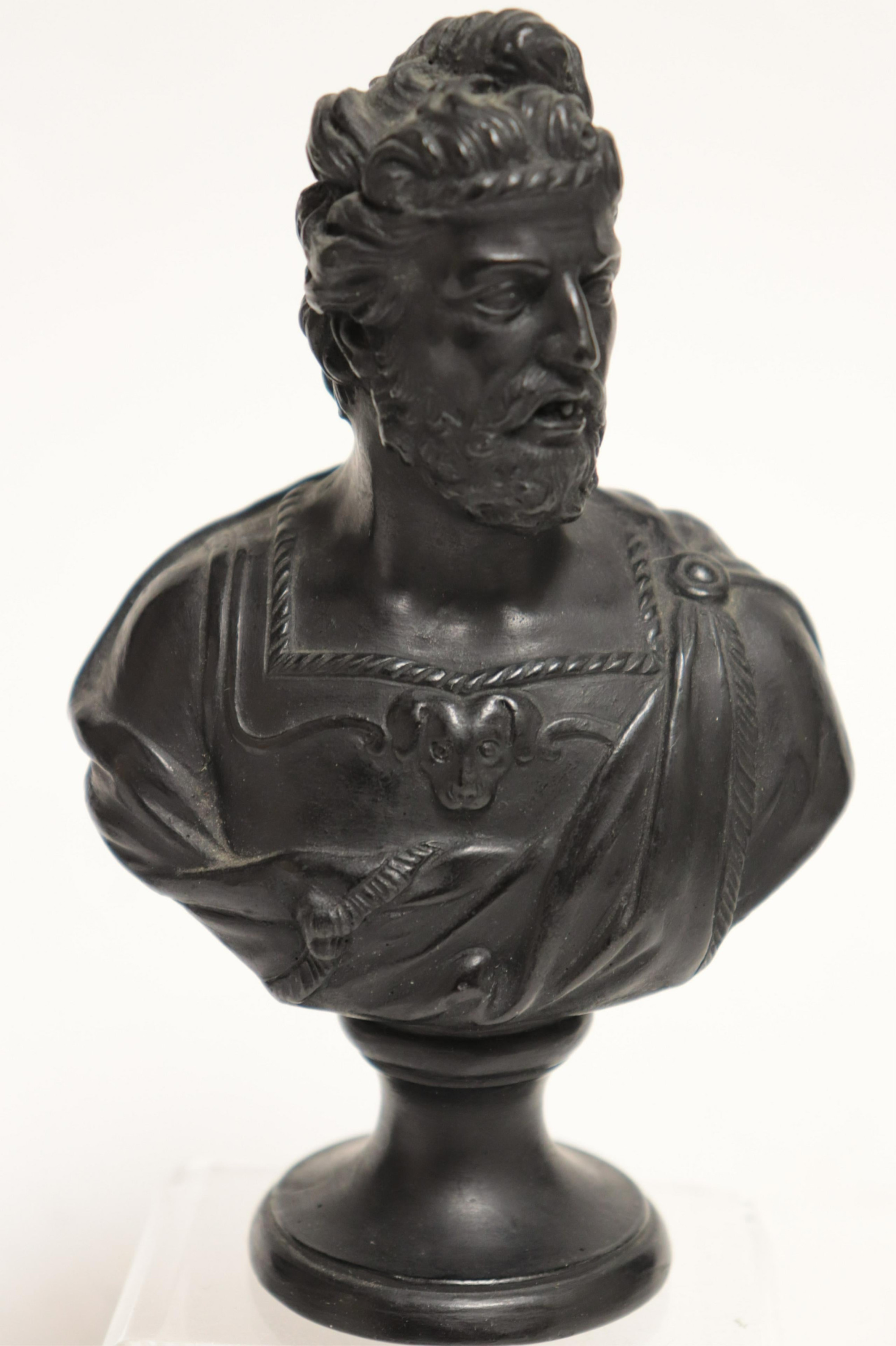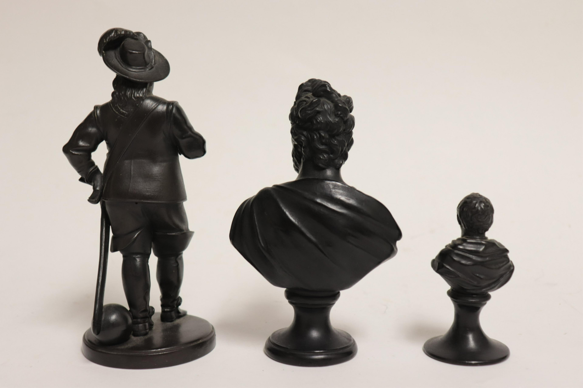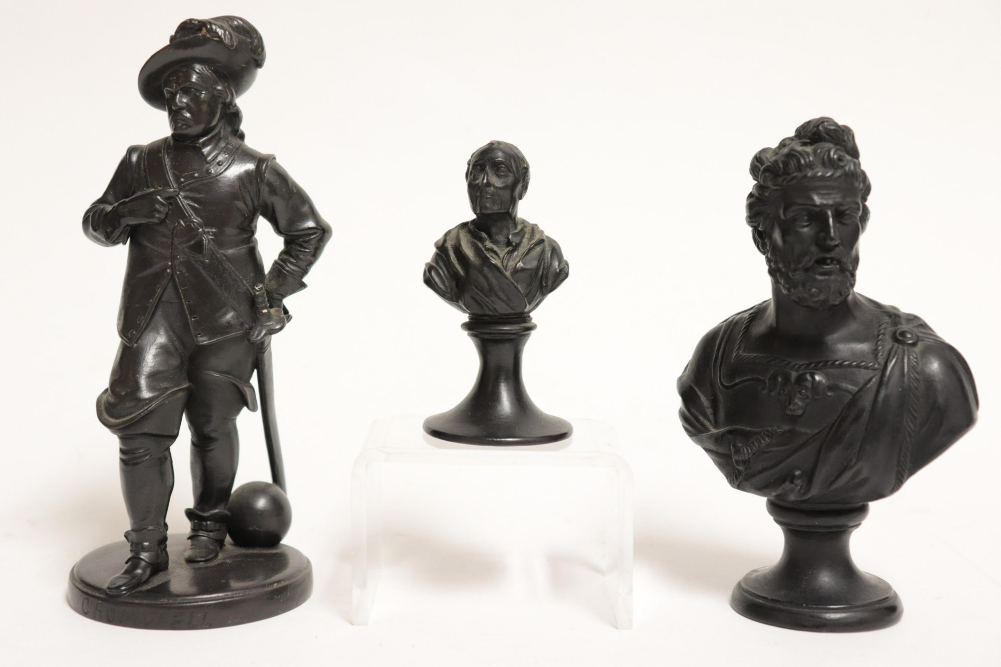 Two small busts & figure of Cromwell. Smaller bust unmarked, other two with impressed mark. Part II from a major collection of Wedgwood, Long Island, NY Dimensions: 3 1/2" H to 6 3/4" H (ZWED4655/3)(WT)