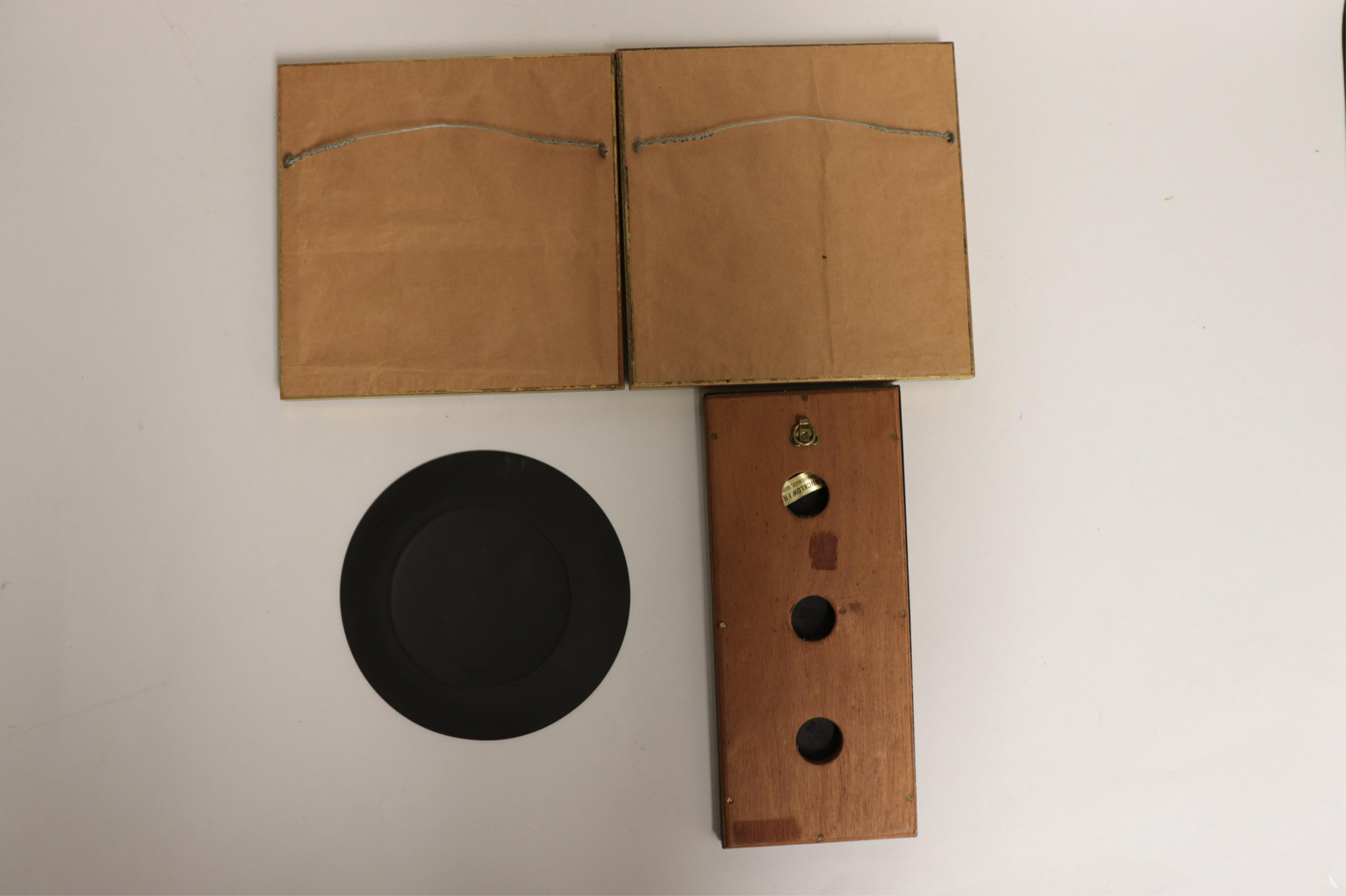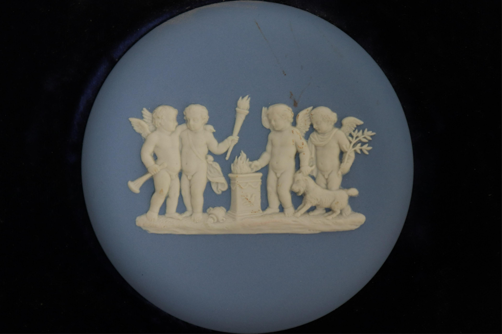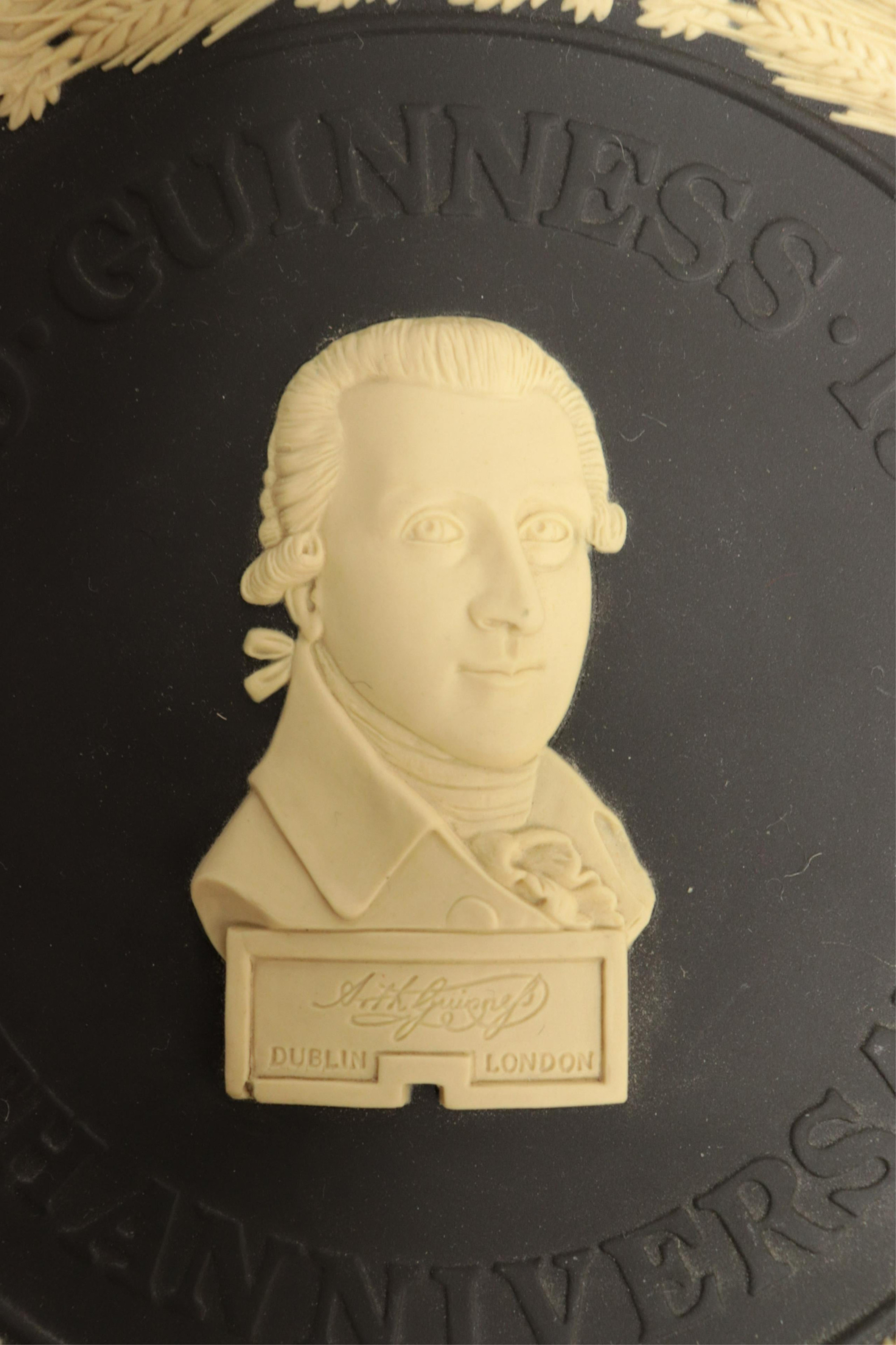 4 Wedgwood Cameos/Plaques, 2 black jasperware "Guinness" and 3 in one frame, both impressed mark & Made in England, and 2 blue jasper putto, backs not visible (4 pc.)