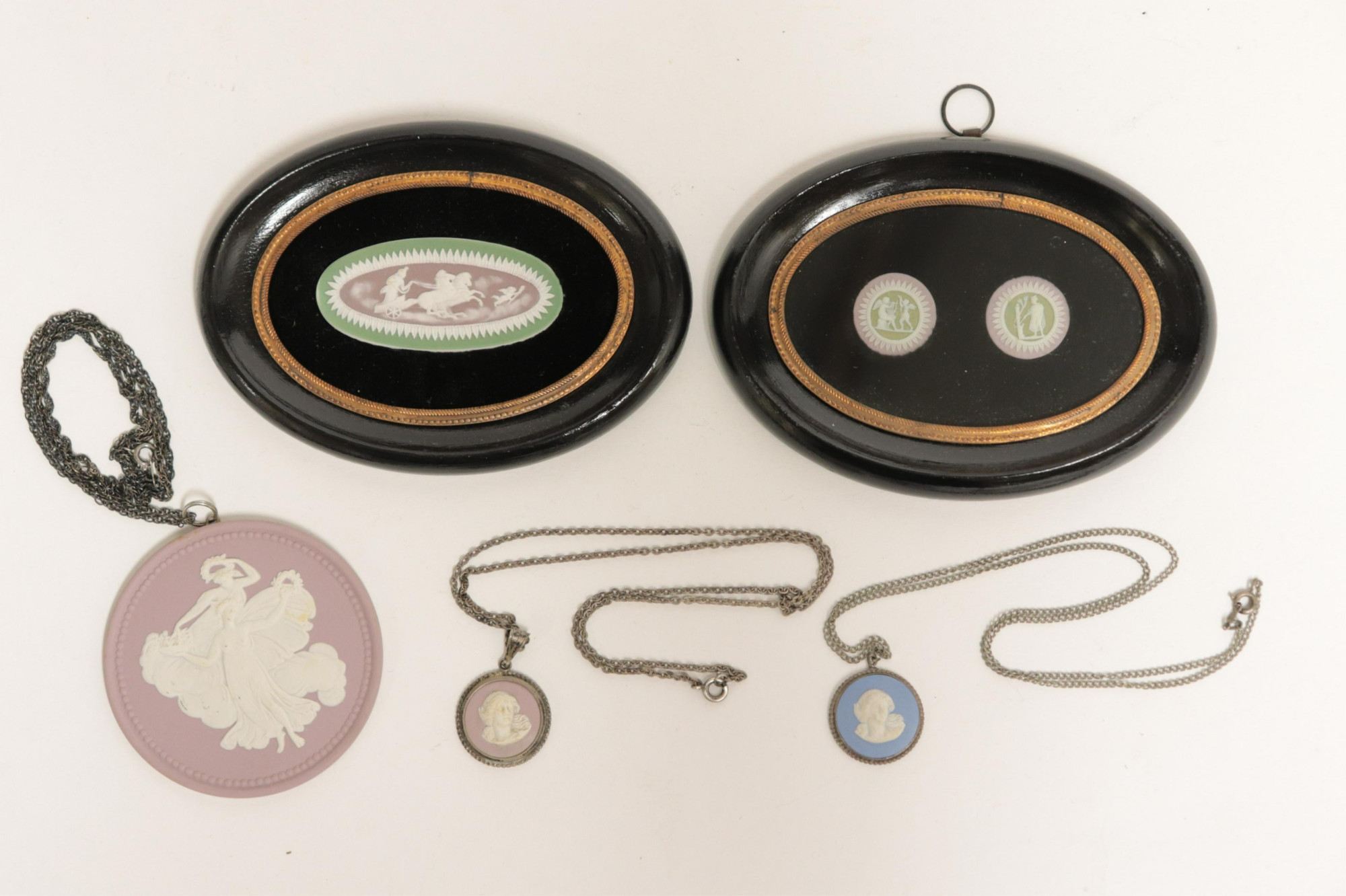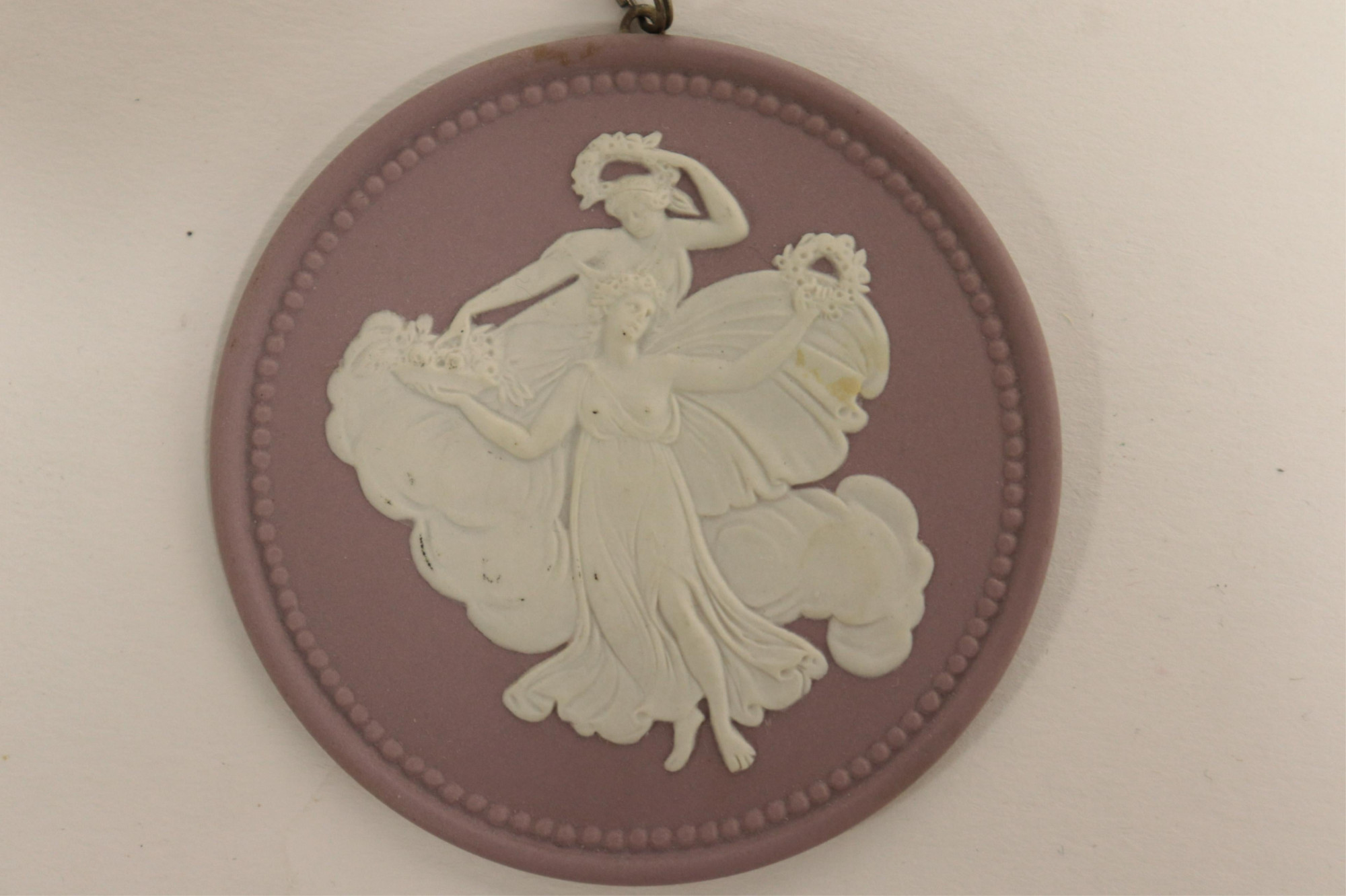 5 Very Small Wedgwood Medallion/Cameos, 3 tri-color, lavender, green & white, impressed mark on single, other back not visible, other 3 with impressed mark & Made in England (5 pc.) Part II from a major collection of Wedgwood, Long Island, NY Dimensions: Smallest 3/4" dia., largest 2 1/2" dia. (ZWED4686/5)(WT)See More
