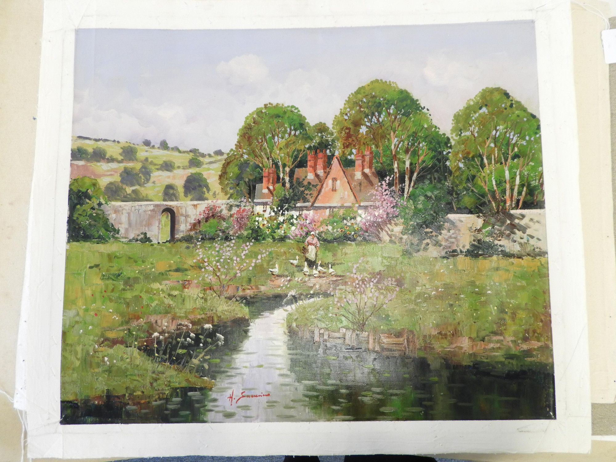 Antonio Sannino (Italian, b. 1956) Farm Blossoming with Geese and Bridge, oil on canvas. Signed bottom center. Property from a fourth generation gallery, NYC Dimensions: 20 x 24" unstretched (HEAR54)(EL)