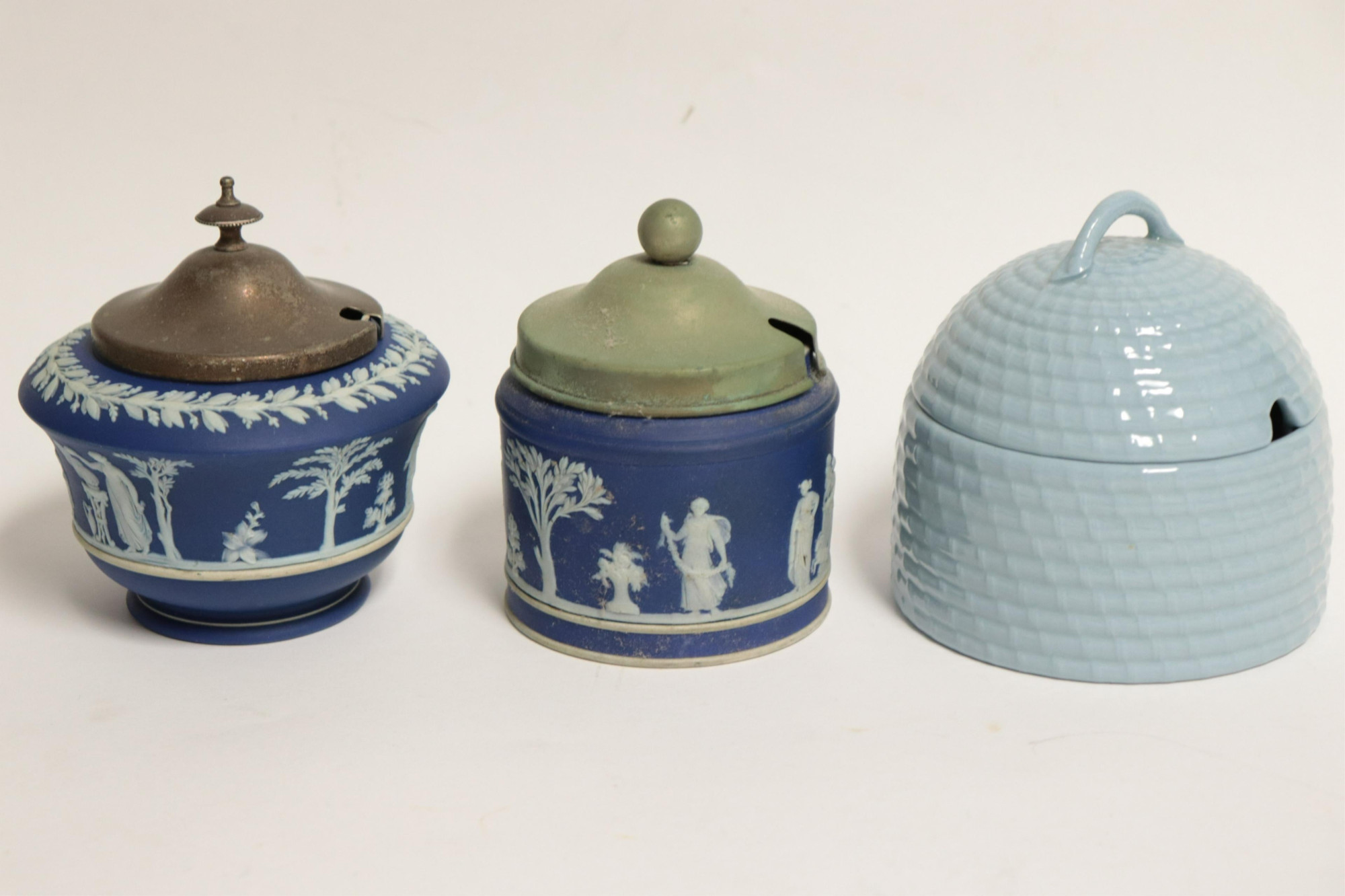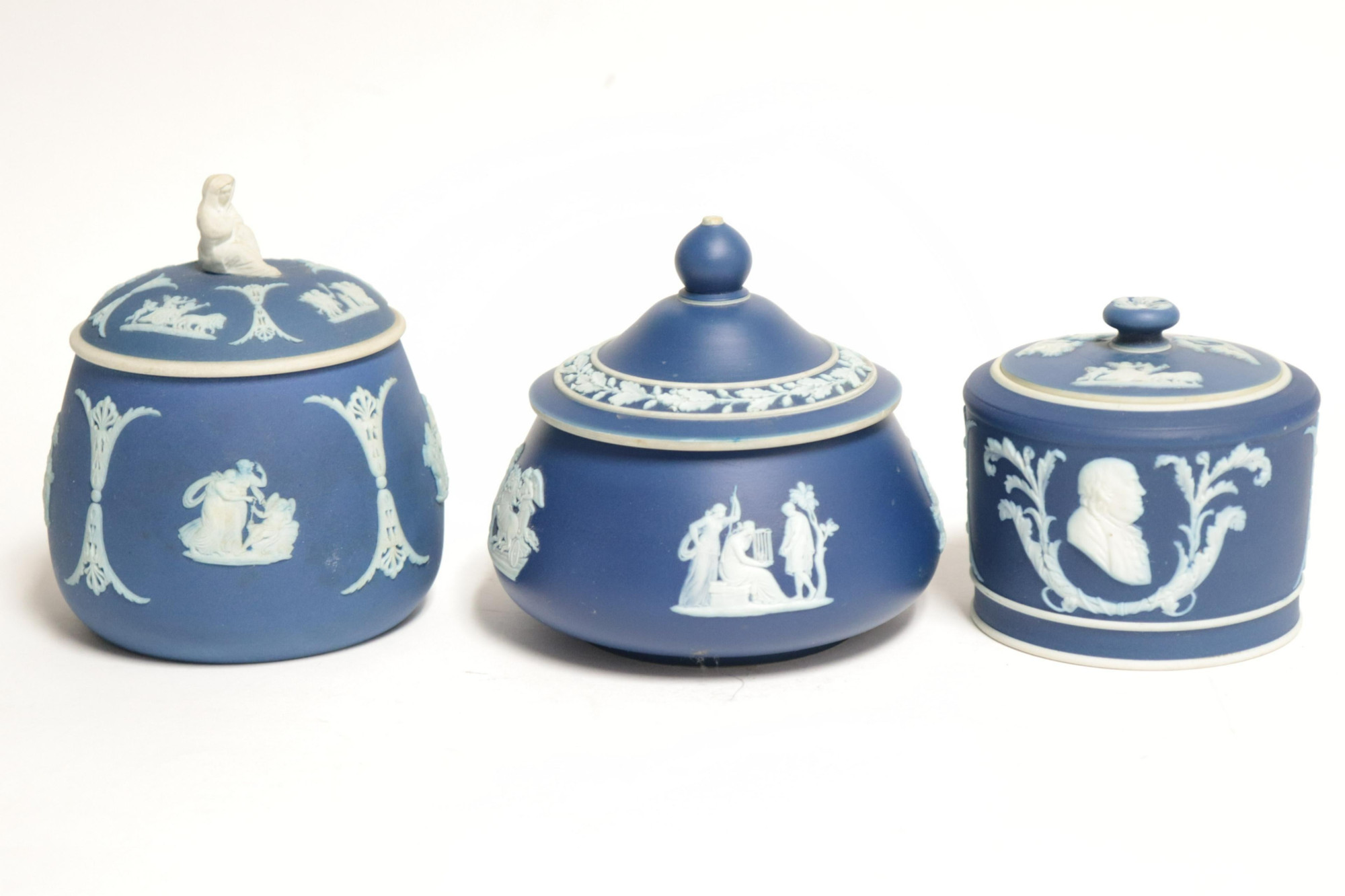 Approx. 20 Wedgwood Blue Jasper Dip Tea Wares, variously marked with impressed marks, England & Made in England (lot) Part II from a major collection of Wedgwood, Long Island, NY Dimensions: Teapot 3 3/4" H, large teapot 6 1/2" H (ZWED4524/lot)(WT)