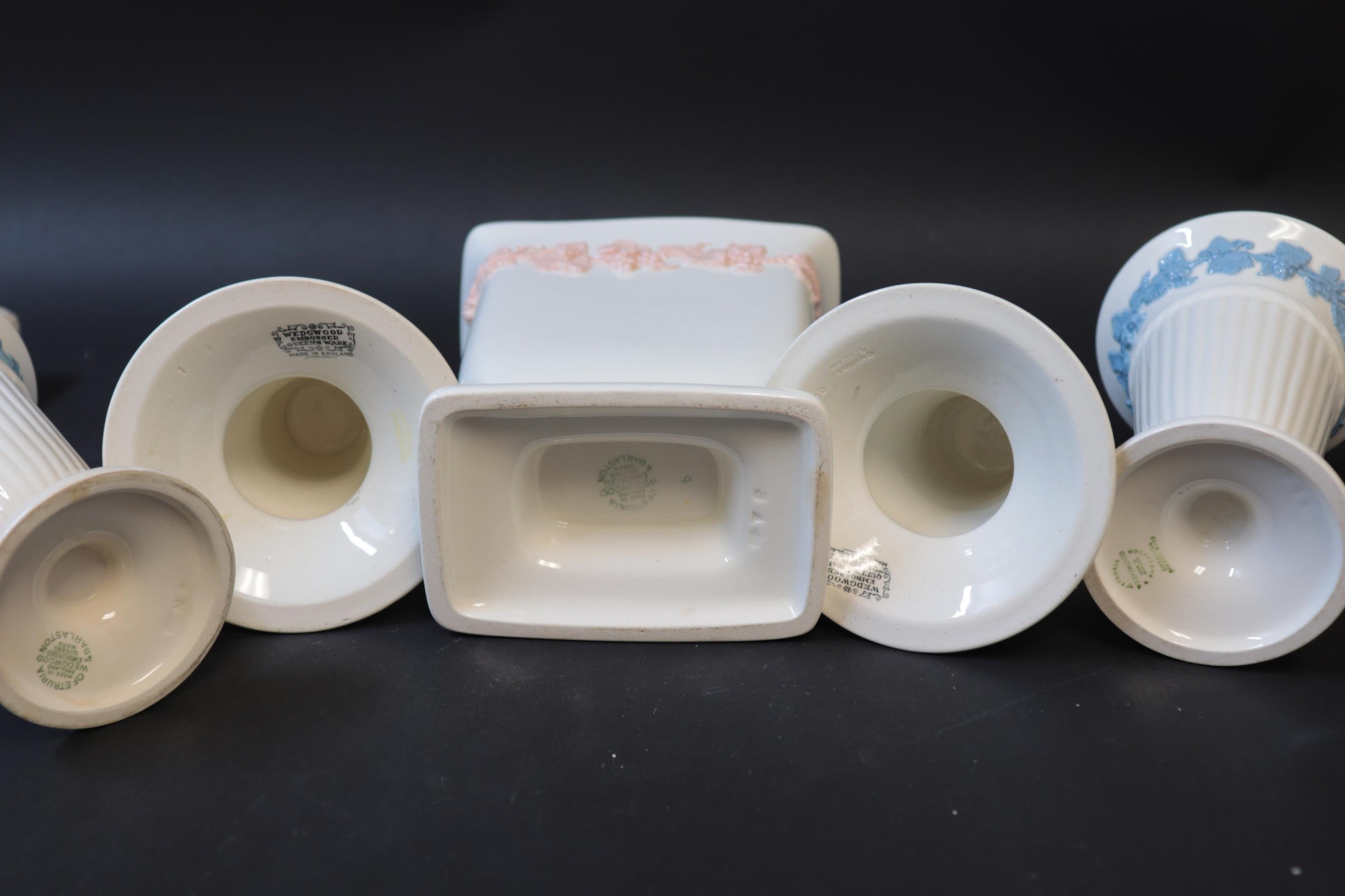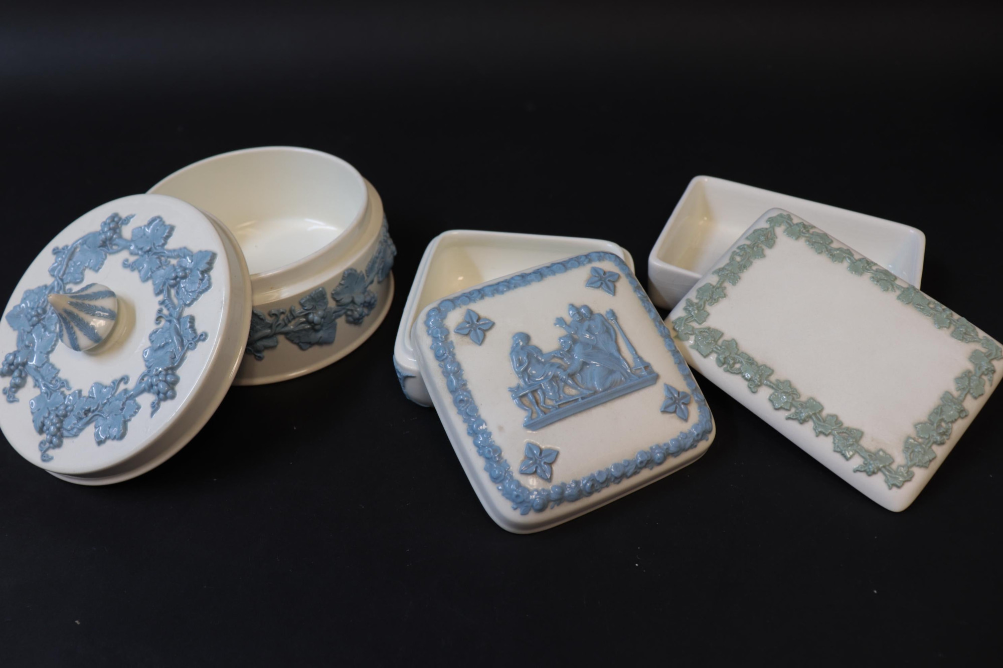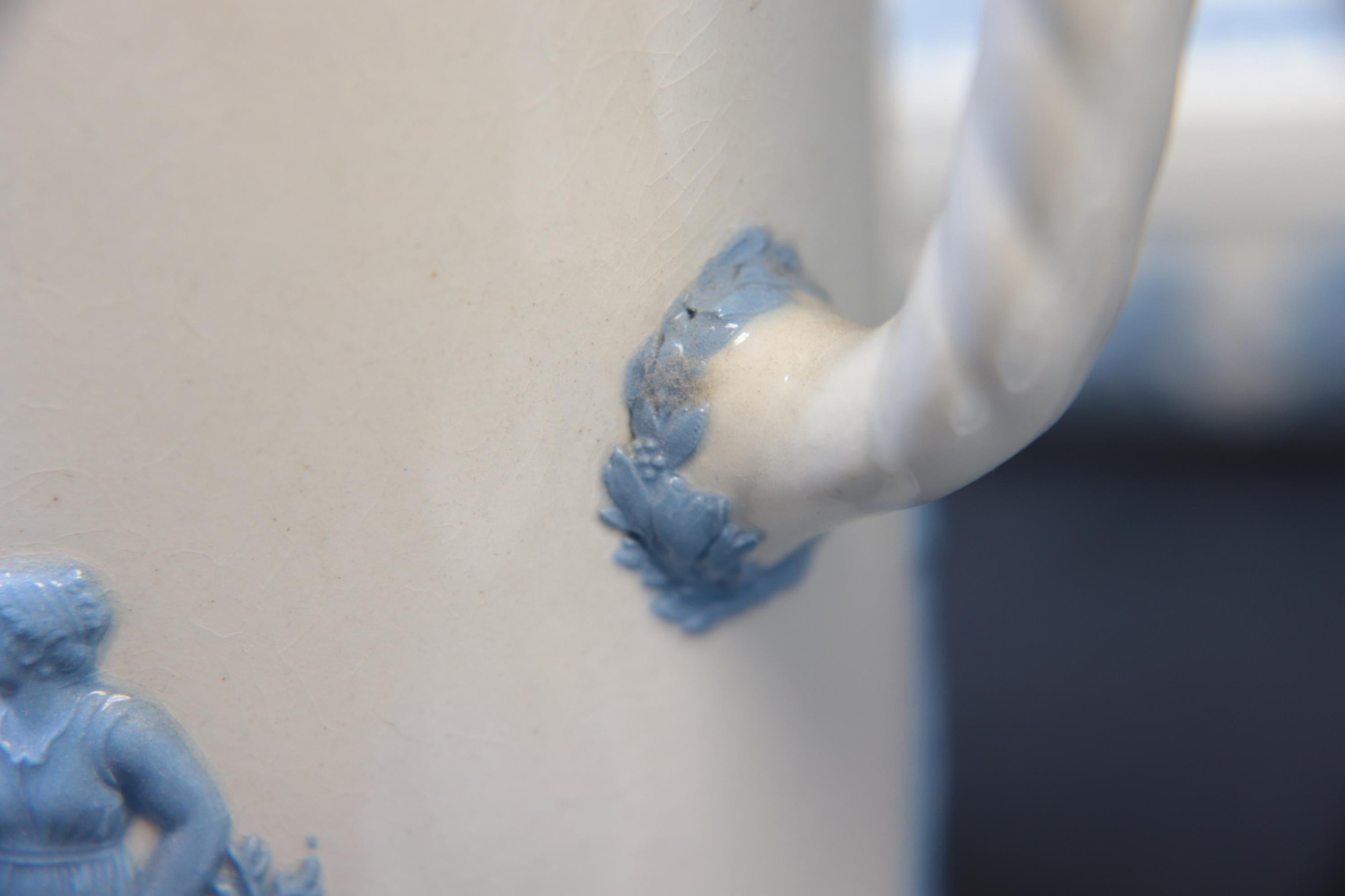 Approx. 25 Pieces of Wedgwood Queensware, white ground with variously colored bands of grape and leaf clusters, various printed marks and some impressed marks (lot) Dimensions: 8 1/2" H x 9 3/4" across ram's head handles (ZWED4440/lot)(WT)See More