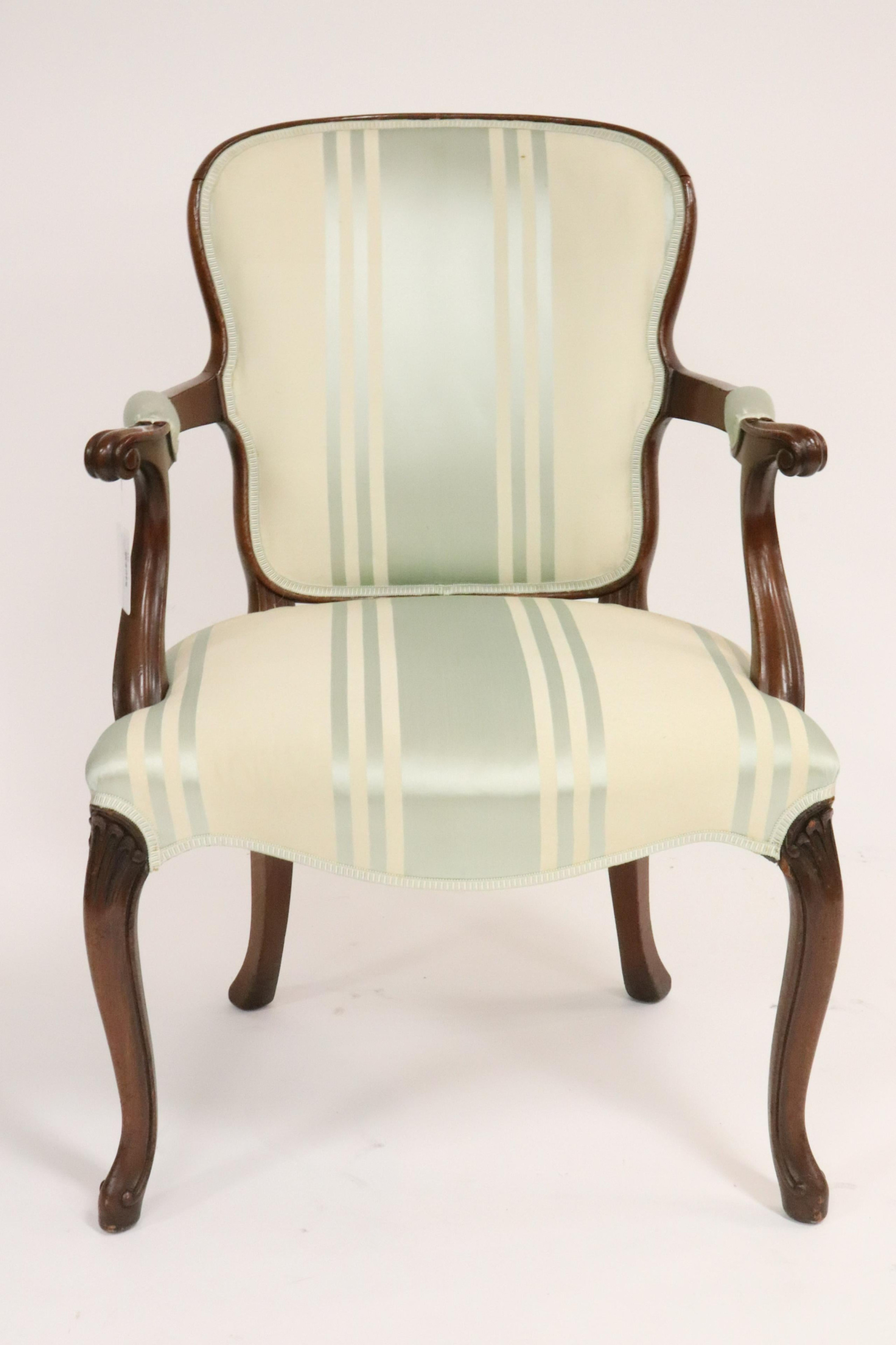 Hepplewhite Mahogany Open Arm Chair, blue & white striped fabric Dimensions: 35" H x 24" W (AHAN5339)(WT)