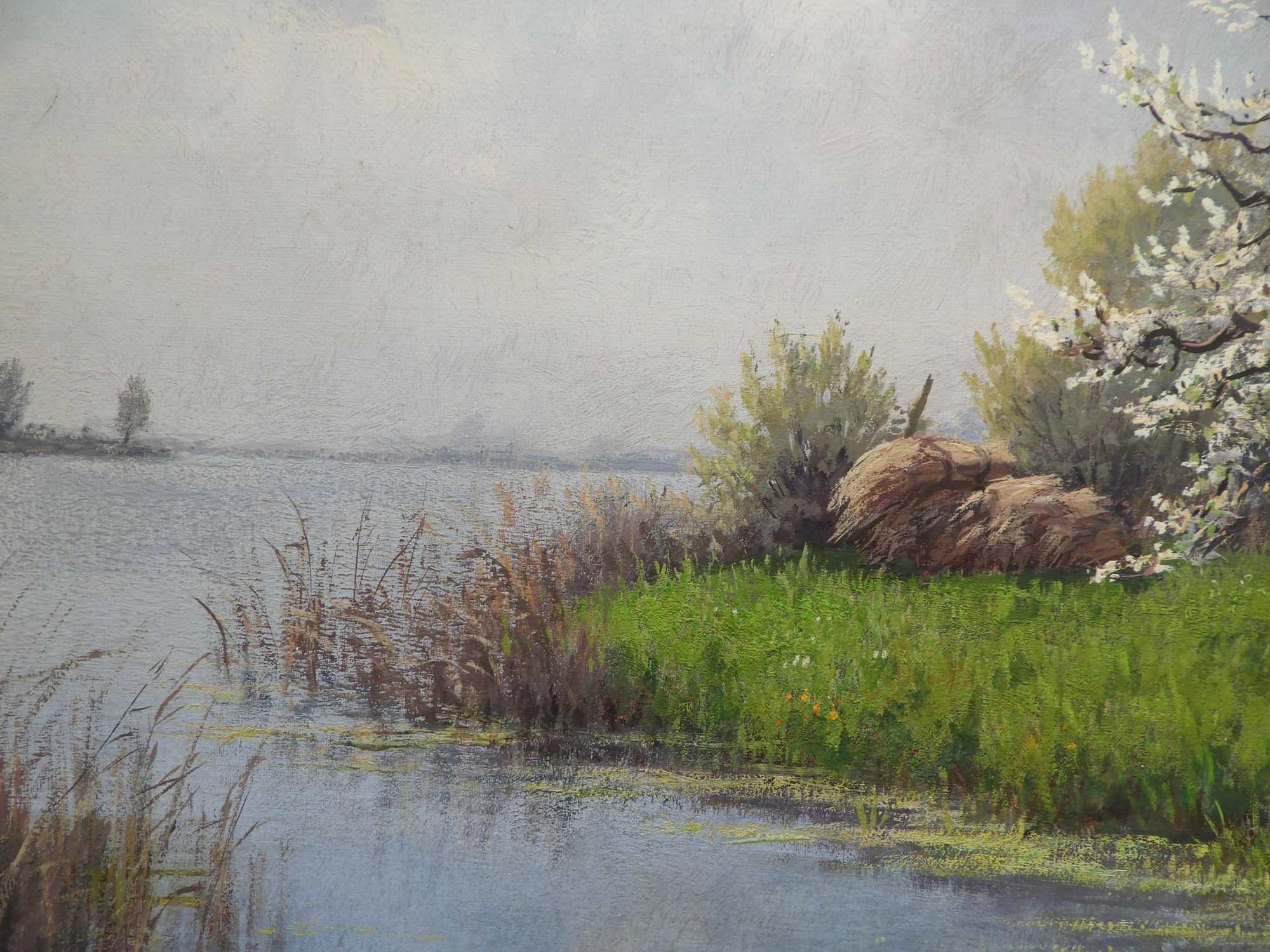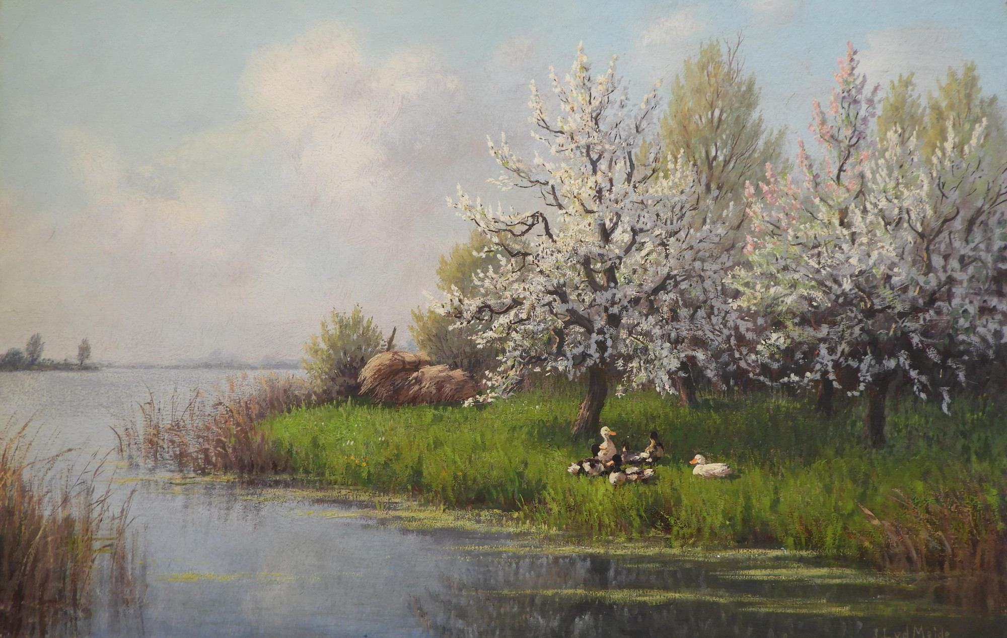 Jacobus Leonardus van der Meide (Dutch, 1910 - 1987) Oil on canvas of ducks and trees at lakeside. Signed lower right. Property from a fourth generation gallery, NYC Dimensions: 24 x 36" unstretched (HEAR238)(EL)