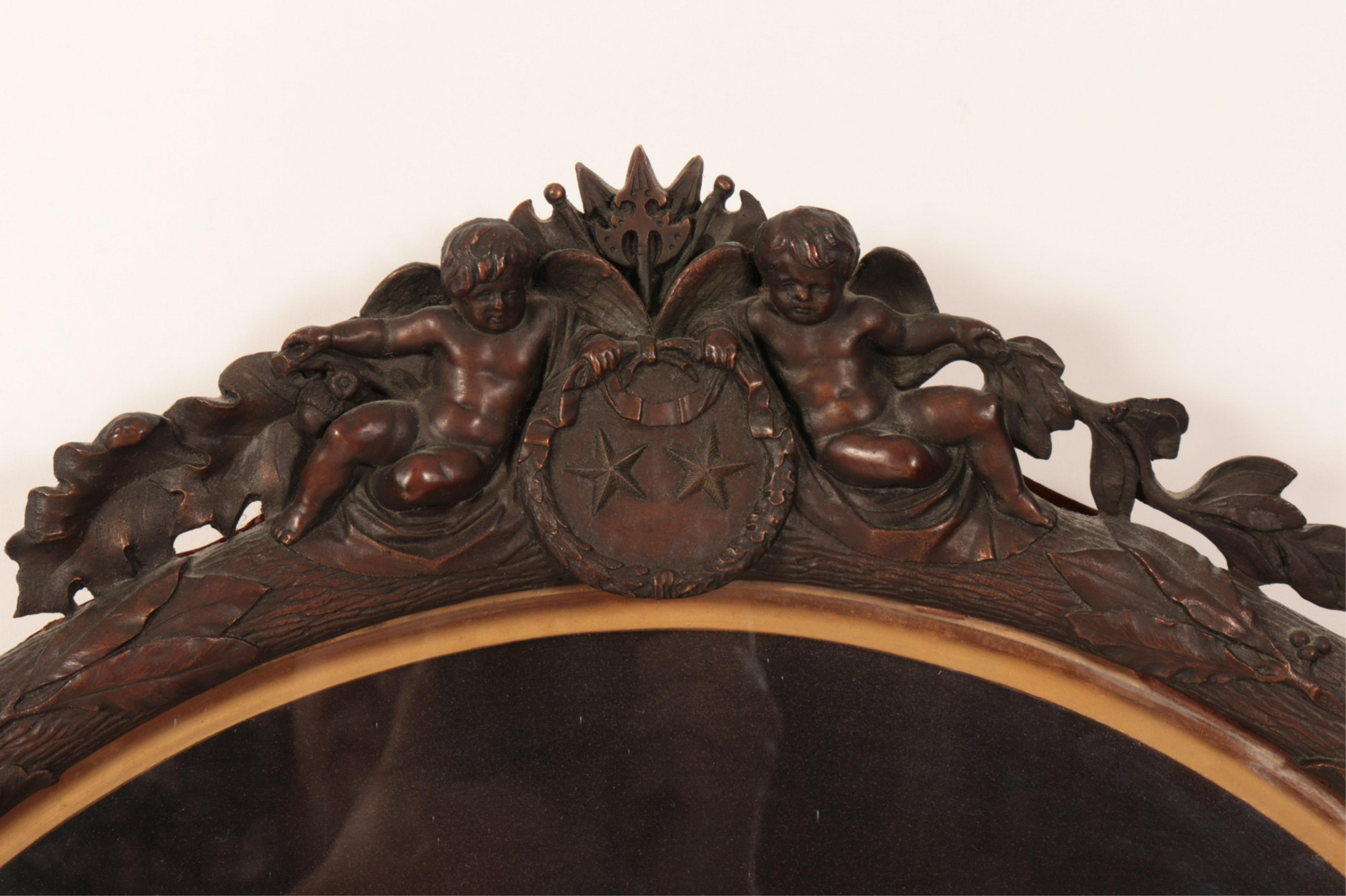 John Quincy Adams Ward (American1830-1910) Bas Relief Plaque of General George Brinton McClellan, 1864, attached to board , under glass, decorative metal arched frame with putti acorn and oak leaf decorative metal frame Dimensions: Framed 21 x 16, relief 11 1/2 x 11 (RMAS473)(MM)See More