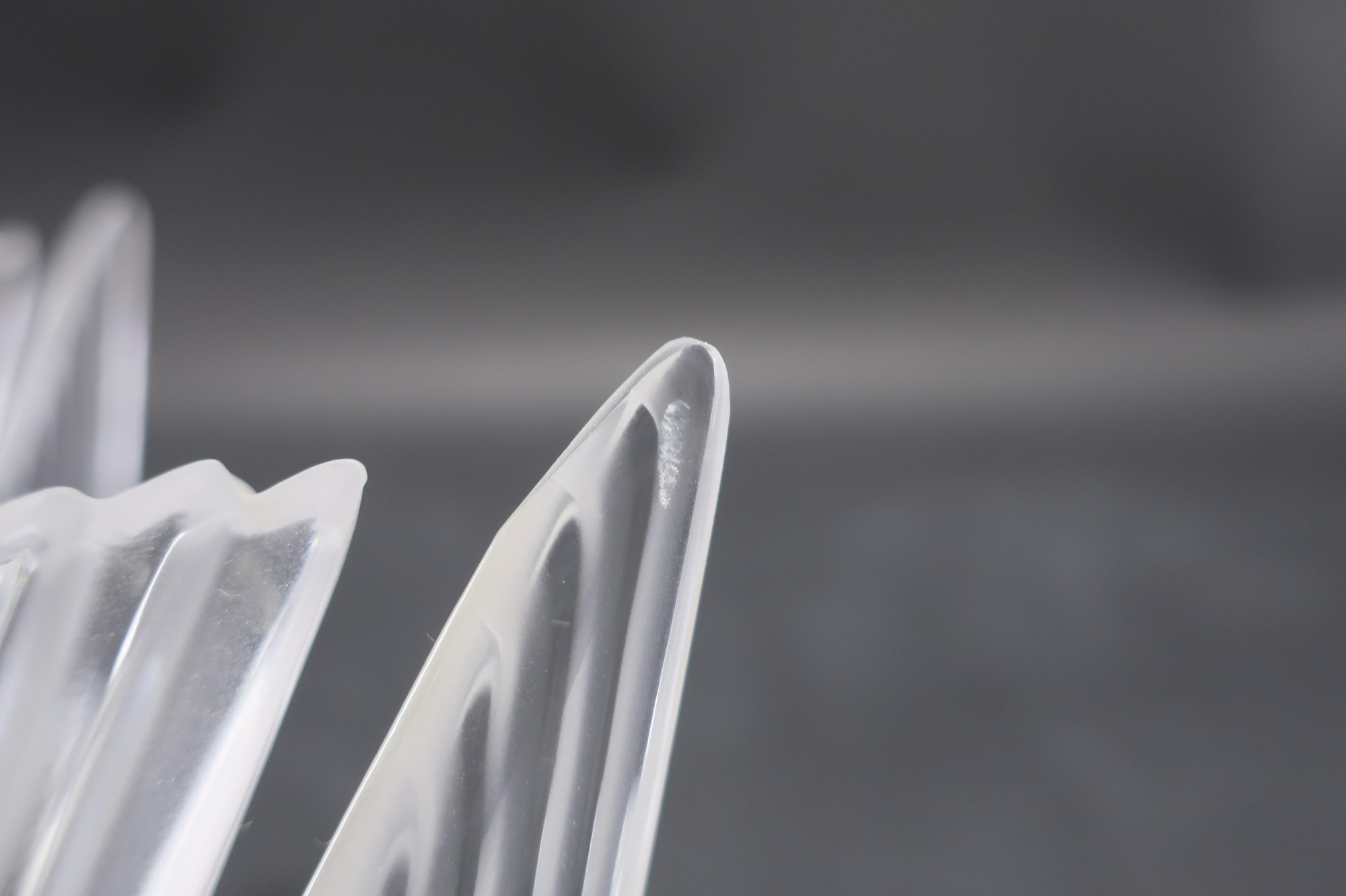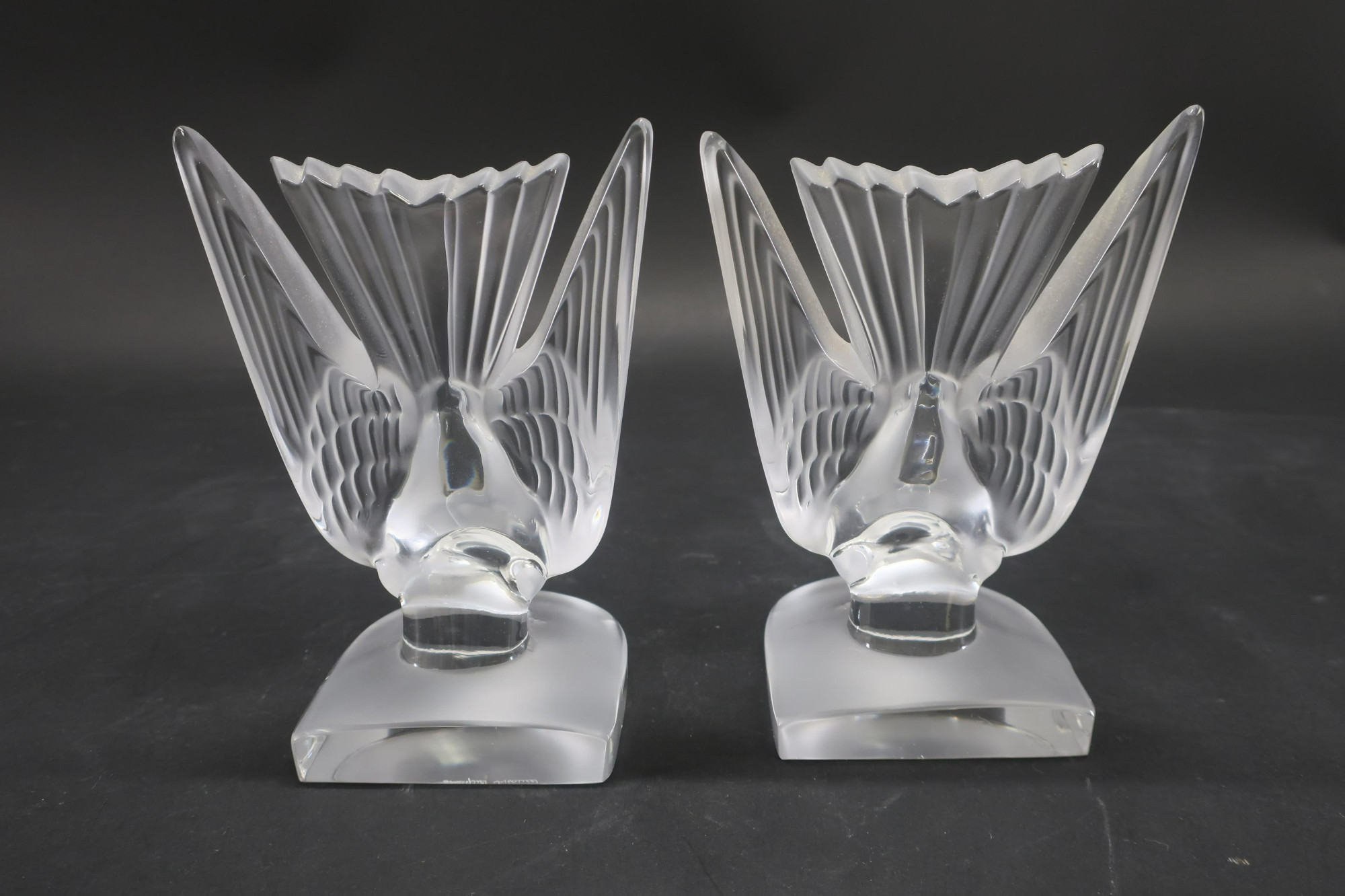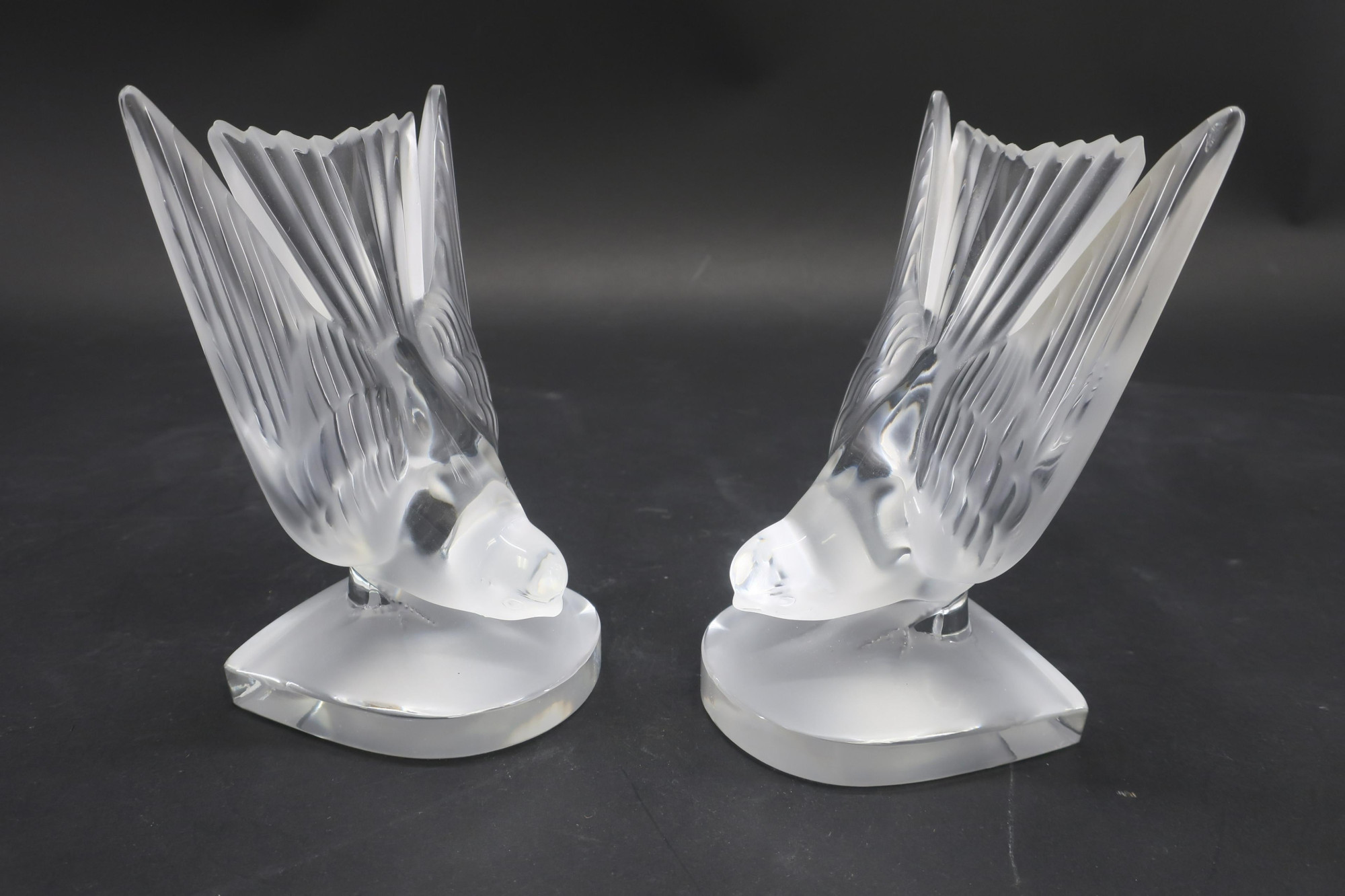 Pair Lalique Glass Hirondelle Swallow Bookends, each inscribed Lalique/France Dimensions: 6 1/4" H (ELB598/2)(MS)