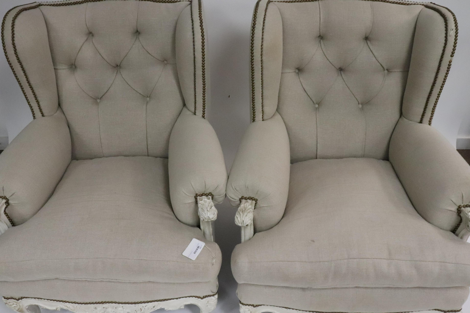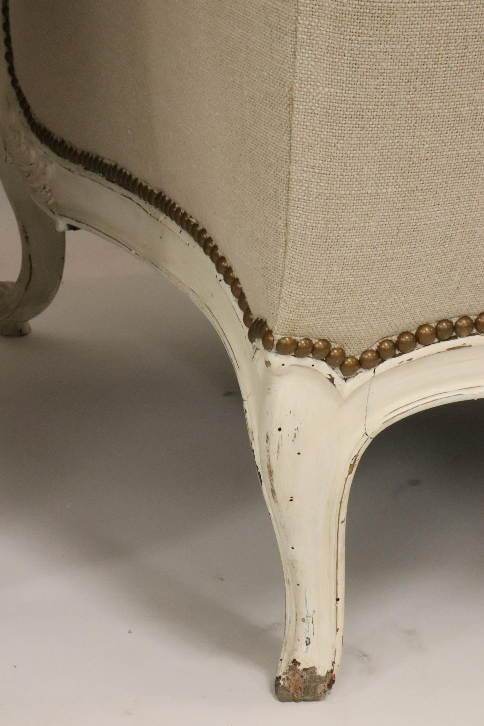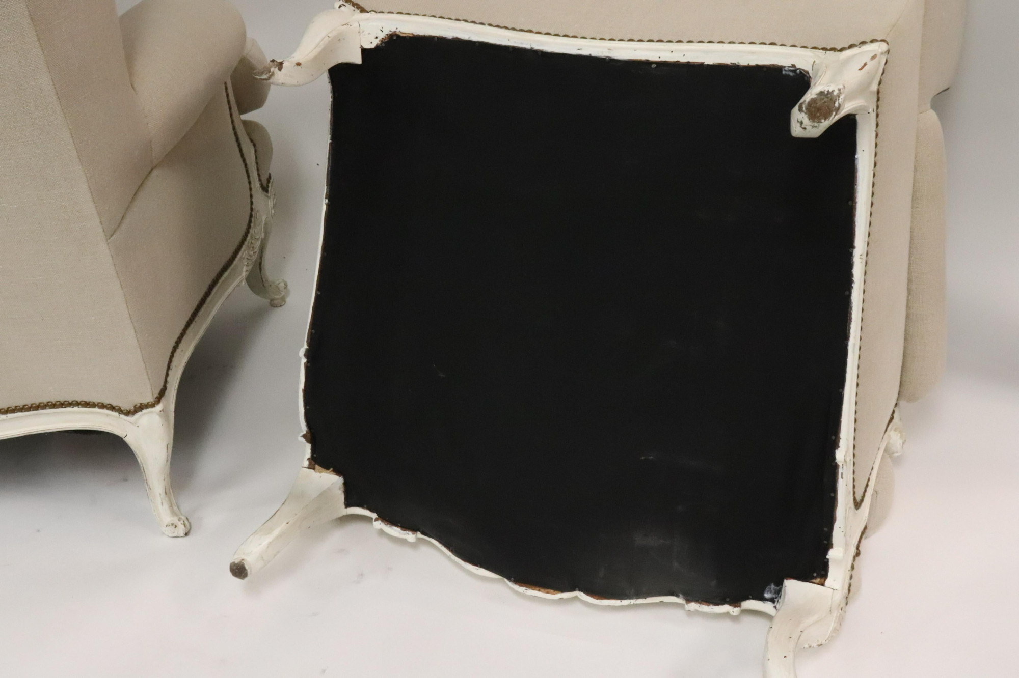 - Pair Oversized Louis XV Style Bergere, white painted frame, beige linen fabric