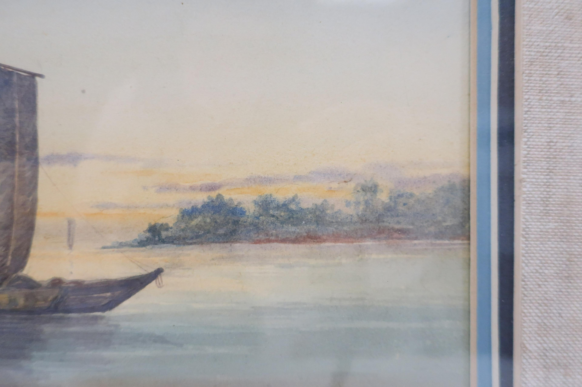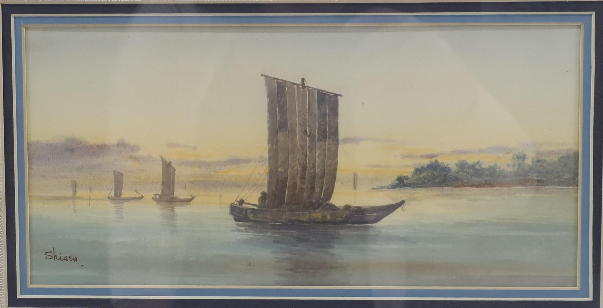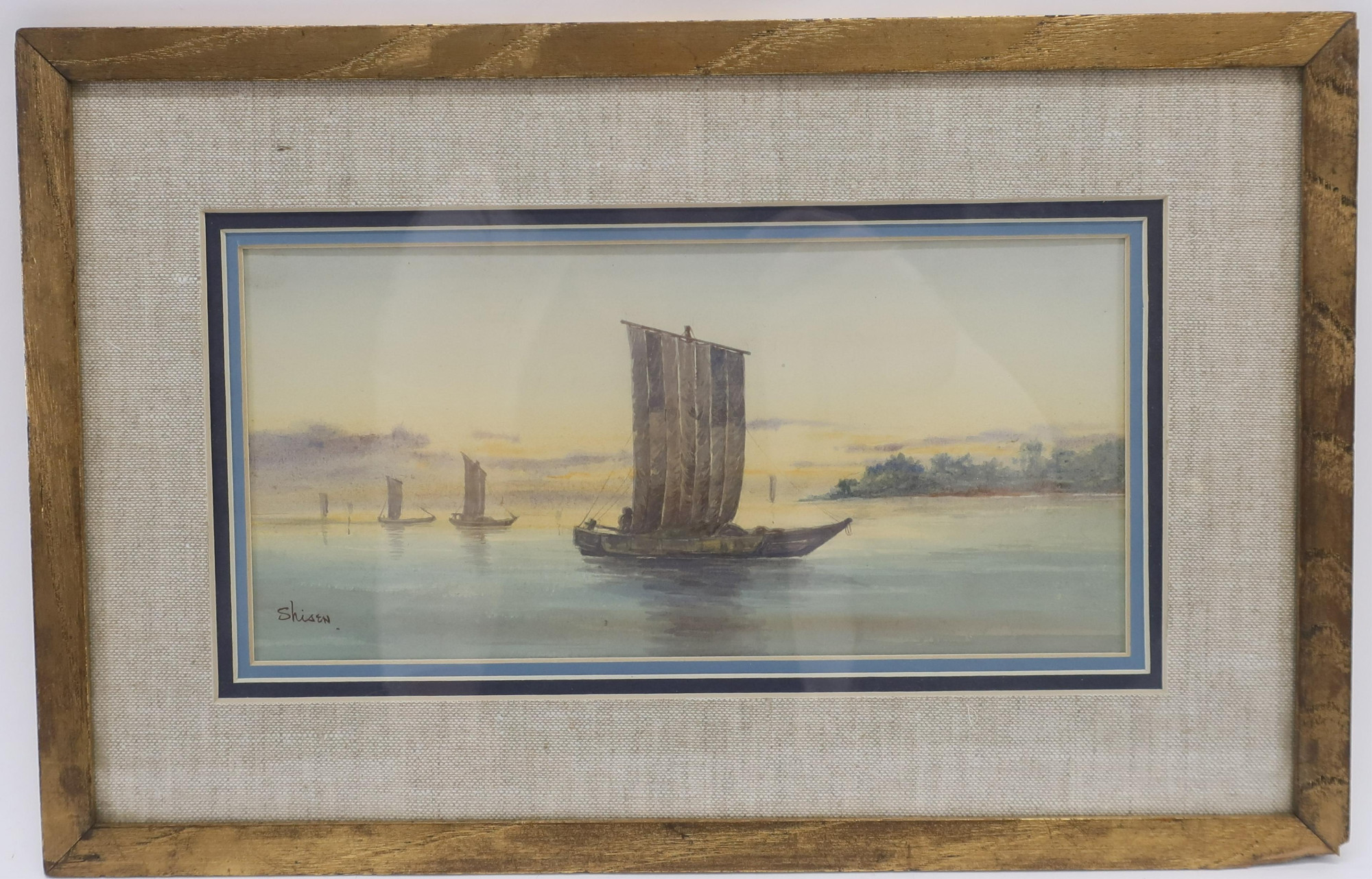 - Boats on calm water, sunned horizon. Signed in ink lower left. Triple matted. Gold painted , wood grain-apparent frame.