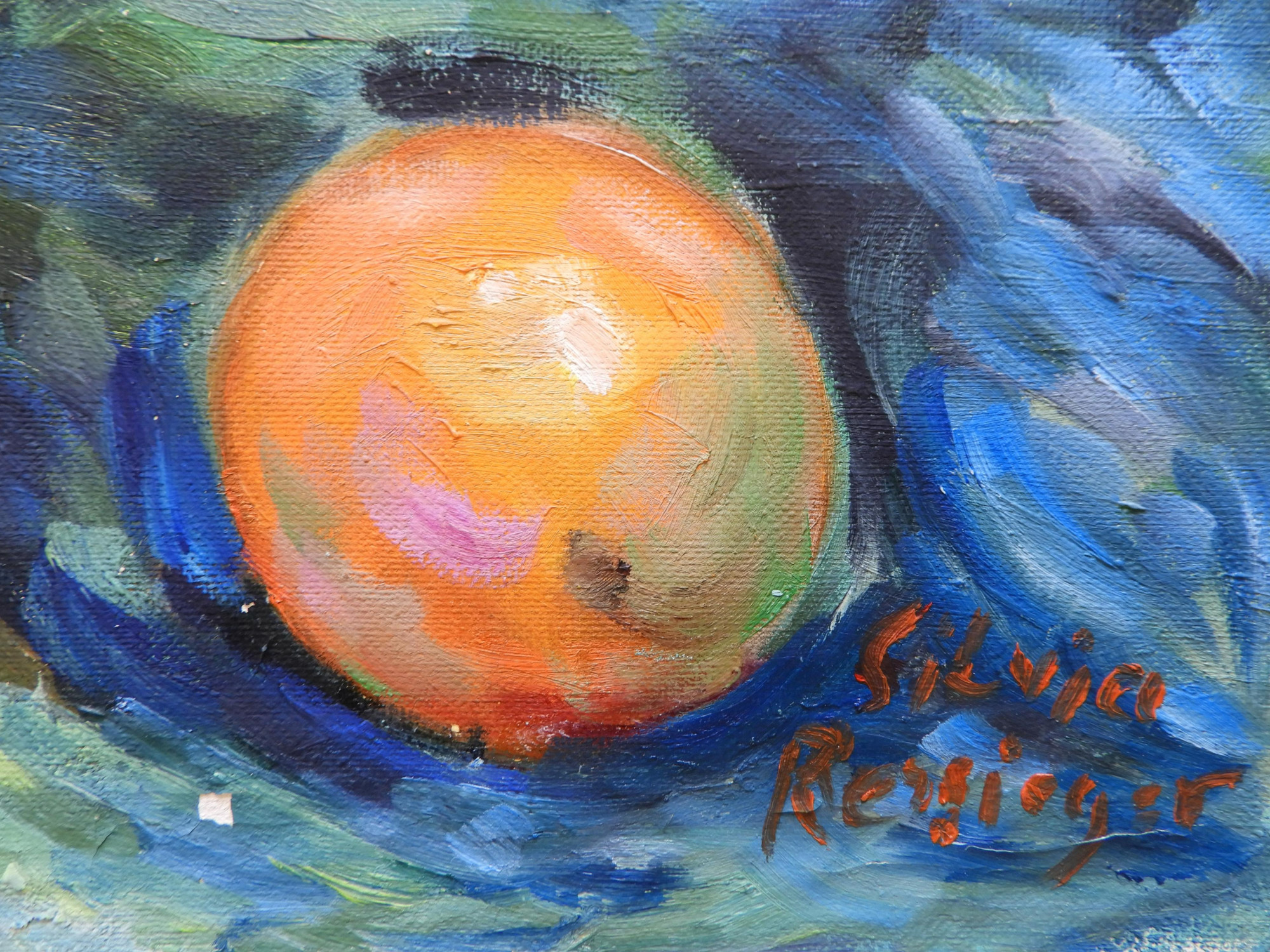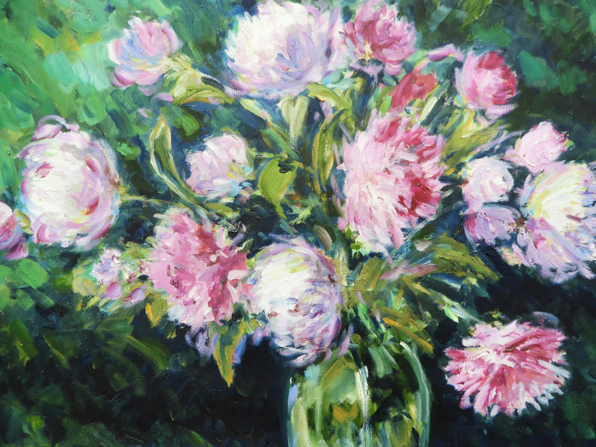 Silvia Reisinger Malva (Austrian, 1956 - 2016) wife of Malva (Syrian, 1951 - 2015). Oil on canvas still life with pink and white peony centerpiece and fruits. Signed lower right.
