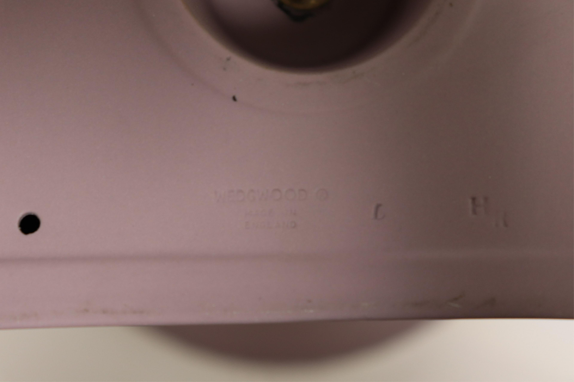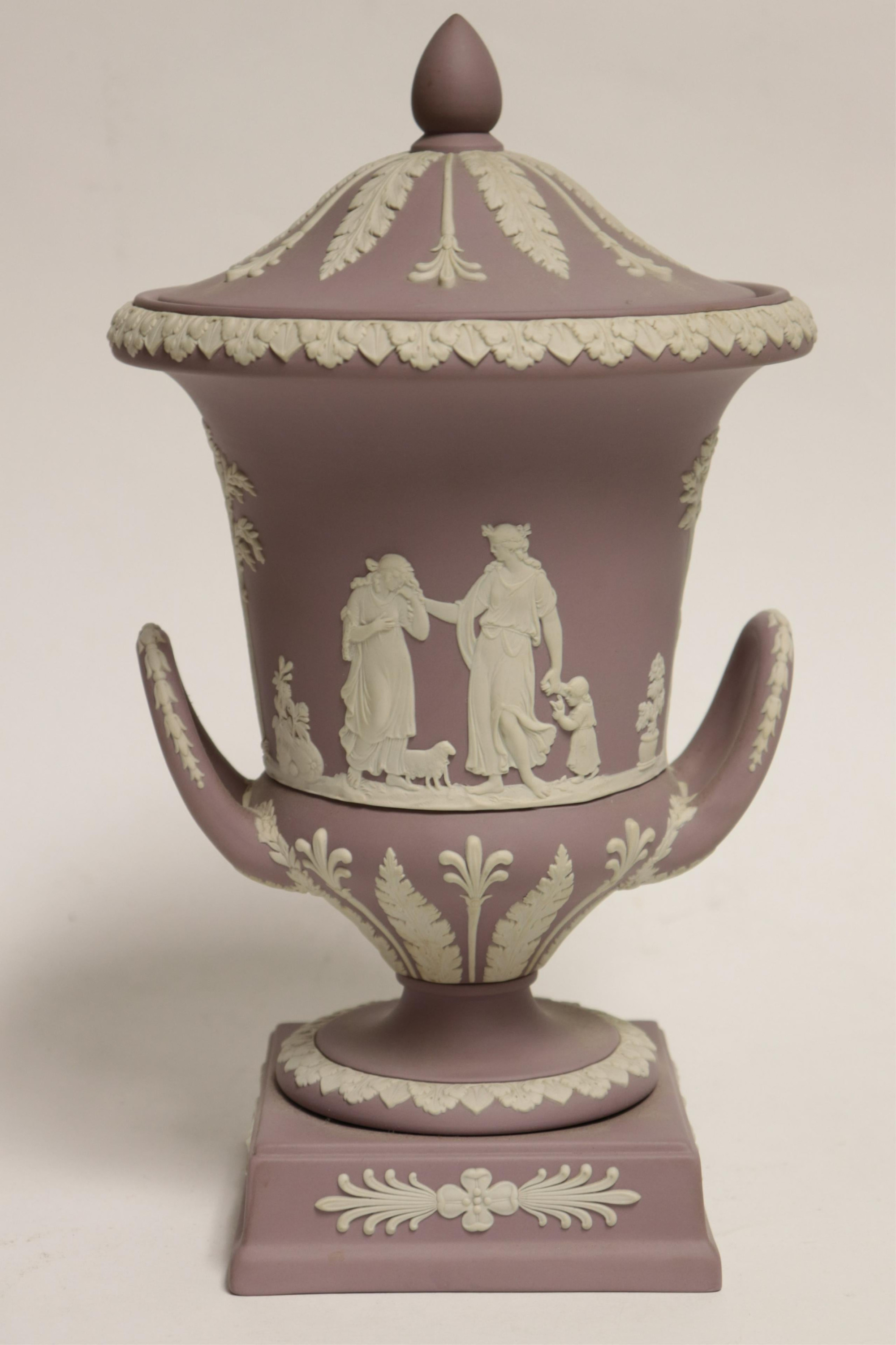 Wedgwood Lavender Jasperware Campagna Shaped Covered Urn, 2 handles, female figures applied in white, impressed mark & Made in England, in 2 parts